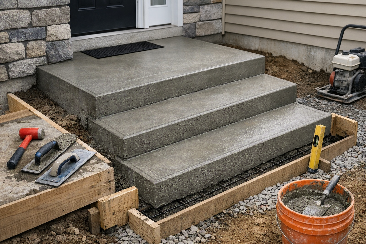 Curing is one of the most important parts of concrete step installation. Even if the surface looks dry within a day or two, the concrete still needs time to gain strength. Keep the steps moist if recommended and protect them from extreme sun, wind, or freezing temperatures during the early curing period.