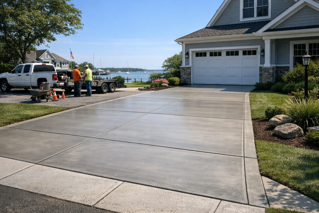 Concrete is a strong, low-maintenance option for coastal Long Island properties. It resists rutting and dust better than gravel, and when installed correctly it handles local temperature swings and salt exposure more reliably than many alternatives. A properly poured concrete driveway also improves drainage and can be finished to match the character of your neighborhood.